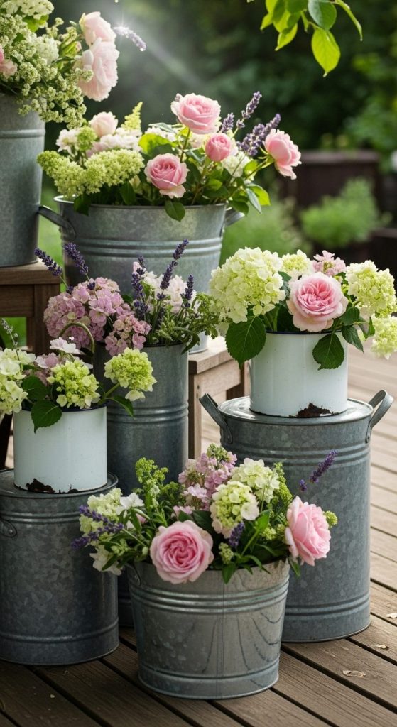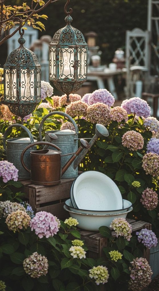 - Adds authenticity — old watering cans, enamel basins, or wrought-iron décor pieces tell a story.