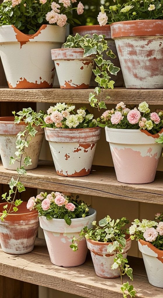 Cracked terracotta, faded paint, or mismatched containers? Perfect! That’s the shabby chic spirit.