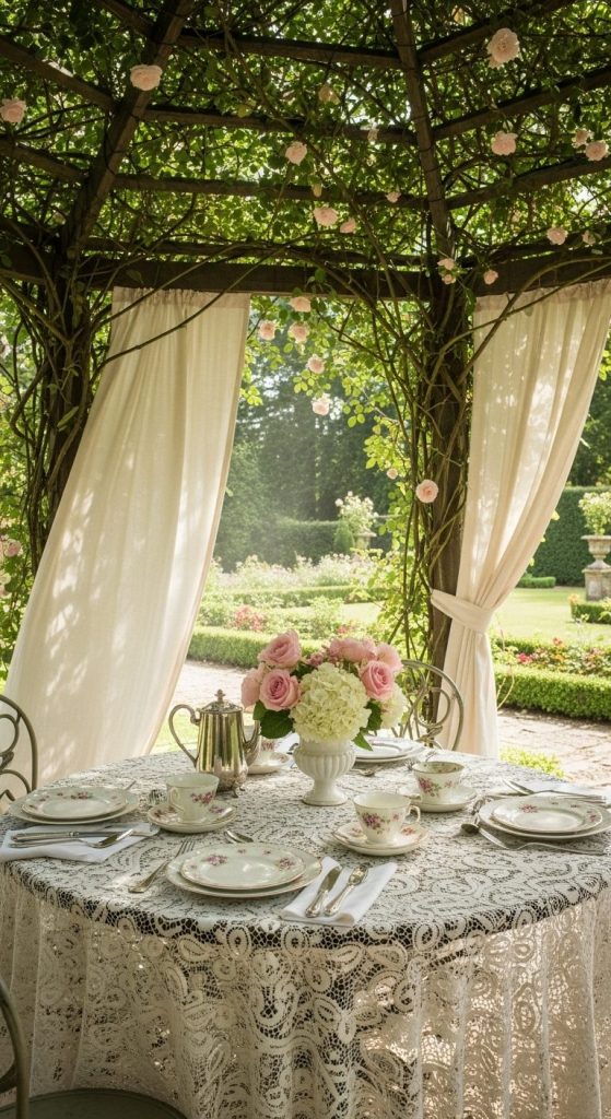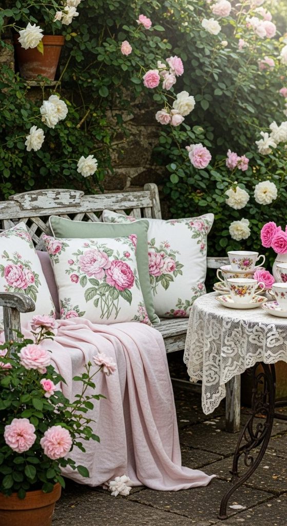 Soft textiles transform outdoor areas into cozy retreats. A lace tablecloth fluttering in the breeze? Instant charm.