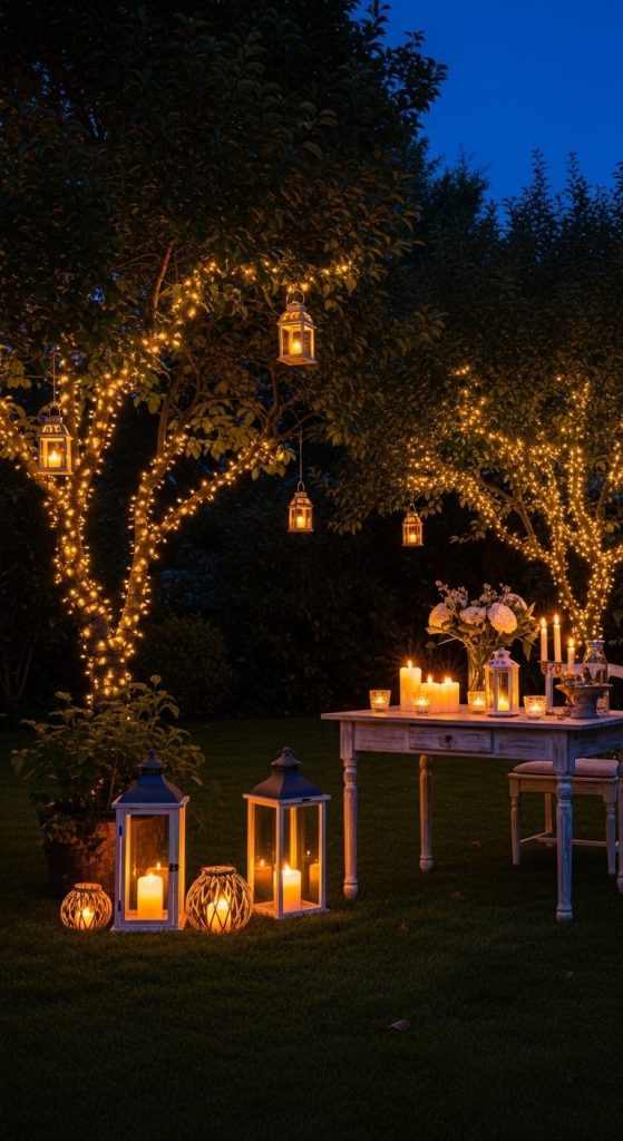Fairy lights, lanterns, and candles create a romantic nighttime glow that feels like a fairy tale.