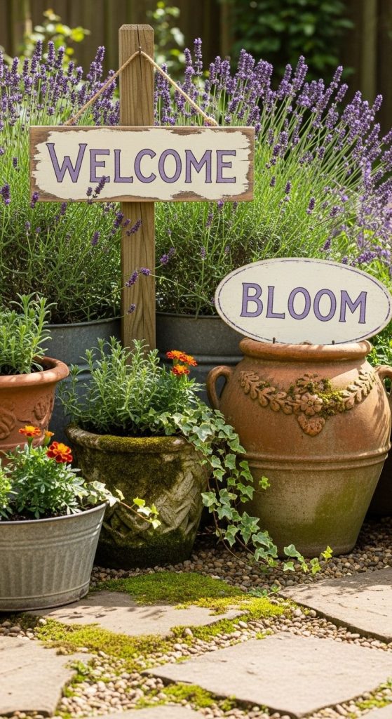 Hand-painted or stenciled wooden signs with words like “Welcome” or “Bloom” instantly set the mood.