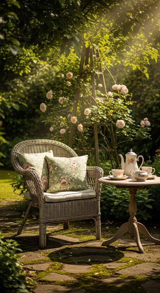 Every shabby chic garden needs a quiet nook — a spot to sip tea or read under dappled light.