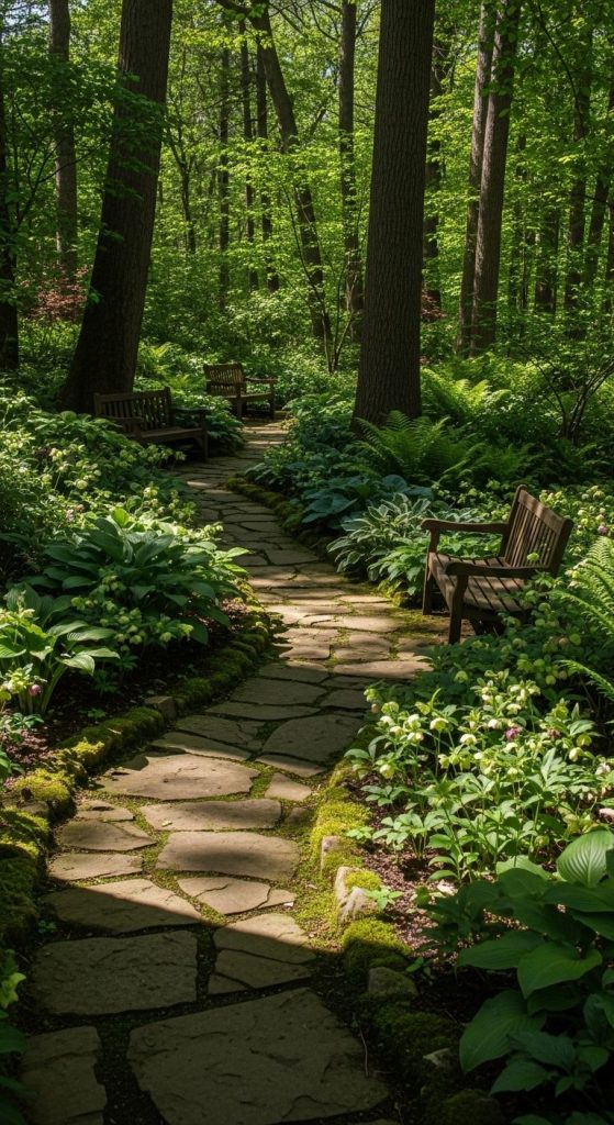 Imagine stepping into your garden and feeling like you’ve entered a quiet forest. A woodland theme is perfect for shaded gardens because it embraces natural shade-loving plants like ferns, hostas, and hellebores.
