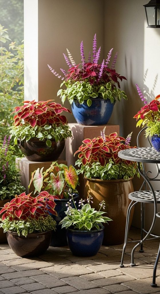 I used big ceramic pots with red coleus once, and my shady patio suddenly looked like an Instagram-worthy café corner. Pro tip: group three pots of different heights for maximum effect.