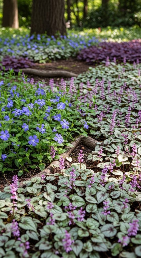 Groundcovers like lamium, vinca, or pachysandra thrive in shady spots where grass just gives up.