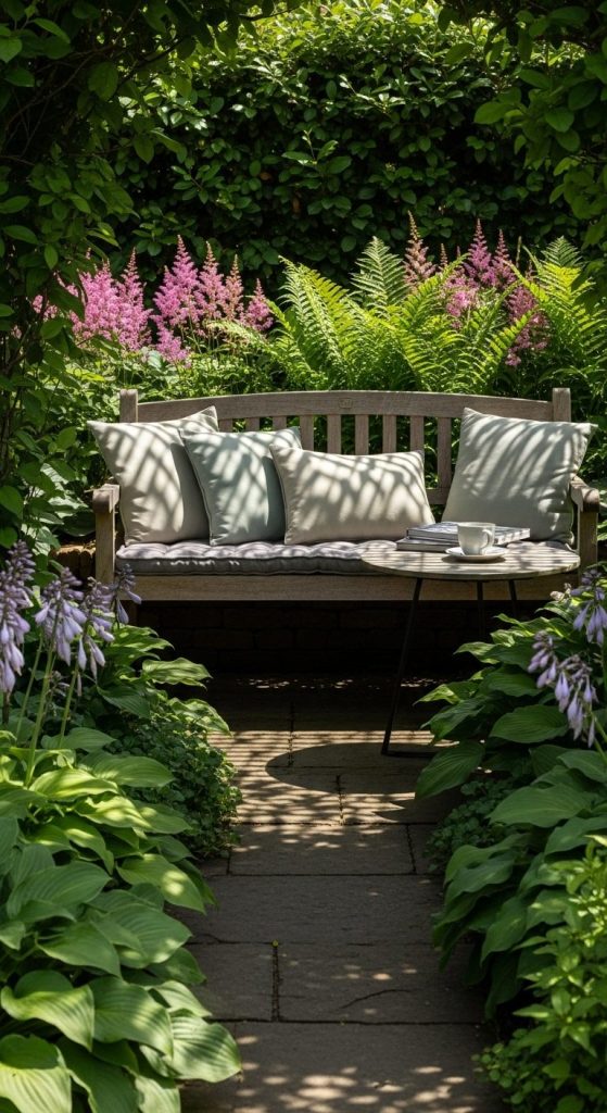Why not use shade to your advantage? Create a cozy seating nook with a bench, cushions, and a small table. Add shade-loving plants around for privacy.