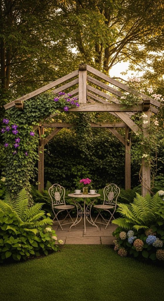 Build a simple pergola in a shaded spot, add climbing plants like ivy or clematis, and you’ve got instant romance.