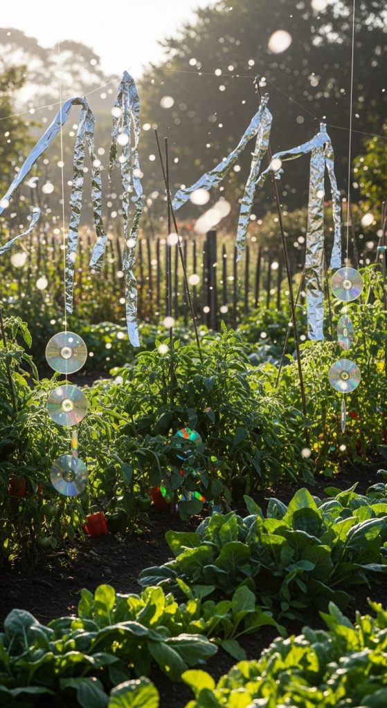 Old-school but effective. Hang CDs, aluminum foil strips, or reflective tape around your garden. The flashing light scares squirrels.