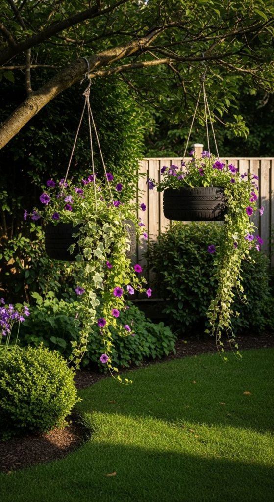 Want to add a vertical touch? Turn an old tire into a hanging garden. Attach sturdy rope or chain and hang it from a tree, wall, or pergola. It’s perfect for trailing plants like ivy or petunias.