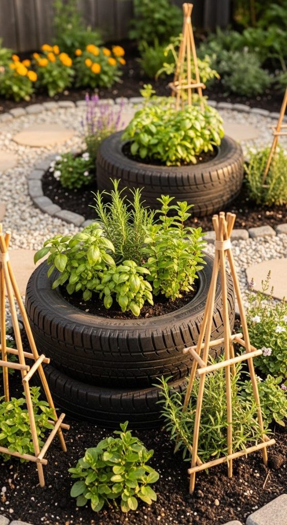 If you’ve dreamed of a kitchen garden but lack space, tires can make that dream happen. Stack two or three tires, fill them with good soil, and start growing herbs like basil, mint, or rosemary.