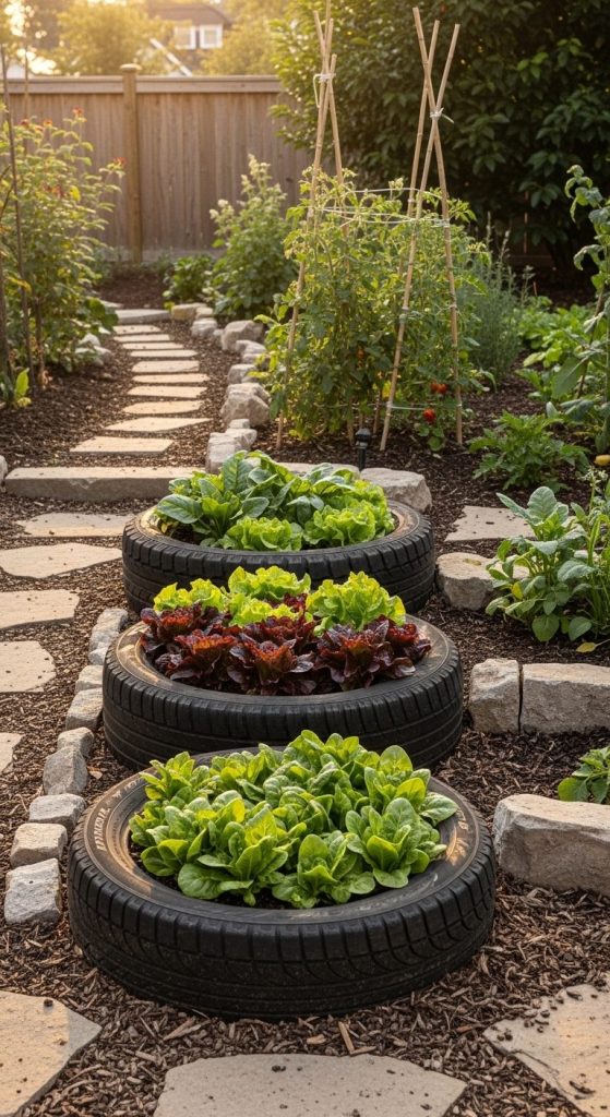 Stack three or four tires of decreasing size to create raised vegetable beds. It’s a clever way to grow lettuce, spinach, or tomatoes while keeping maintenance low.