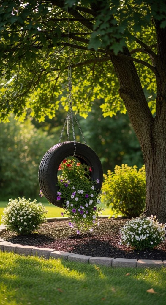 Here’s a nostalgic twist — transform an old swing tire into a planter. Suspend it from a sturdy tree branch, fill it halfway with soil, and plant trailing flowers.