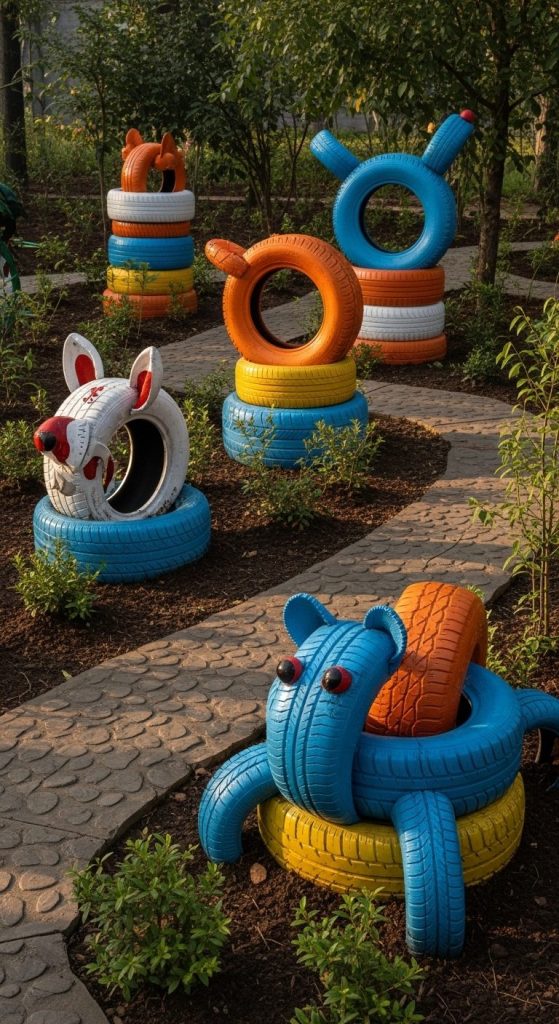 Feeling artistic? Stack and shape tires into animals, mushrooms, or abstract art forms. Paint them in creative ways to turn your garden into an outdoor gallery.