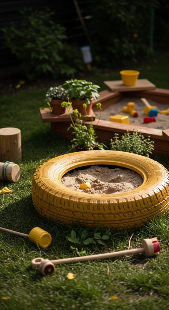 A tire sandbox is the ultimate upcycled joy zone — creative fun that keeps little hands busy.