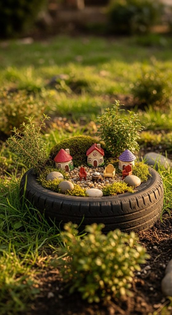 The cutest idea of them all: turn a small tire into a whimsical fairy garden. Add tiny houses, moss, pebbles, and miniature furniture for that storybook charm.