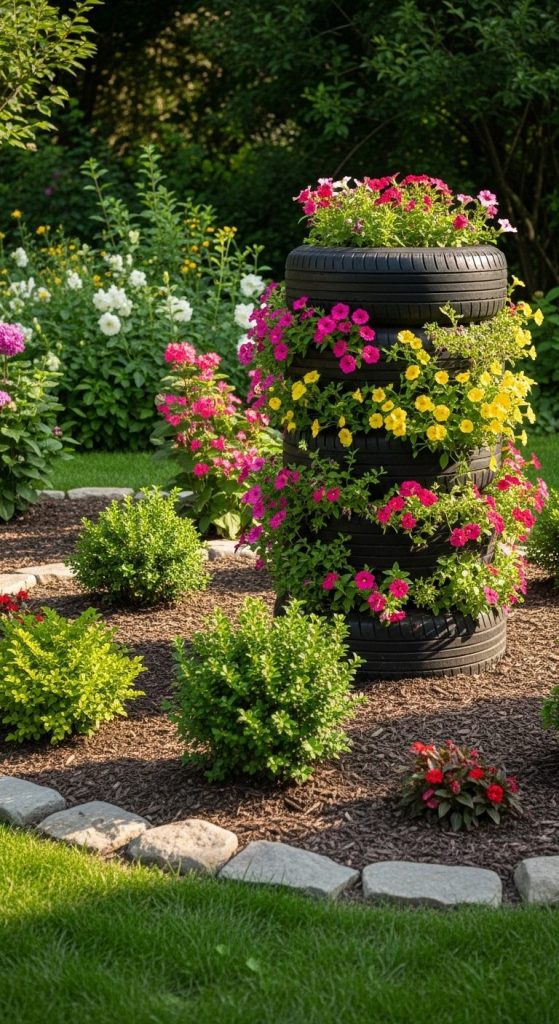 Stack multiple tires vertically, filling each layer with soil and flowers. The result? A striking floral tower that draws attention and saves space.