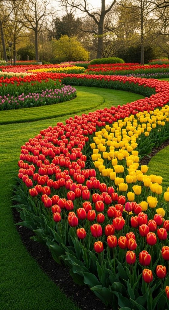 Imagine a sweeping swath of red, yellow, or pink tulips hugging the edge of your lawn. It’s dramatic, feels like a celebration, and plants your spring-garden flag firmly.