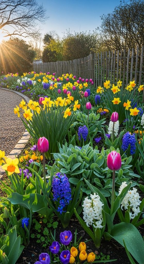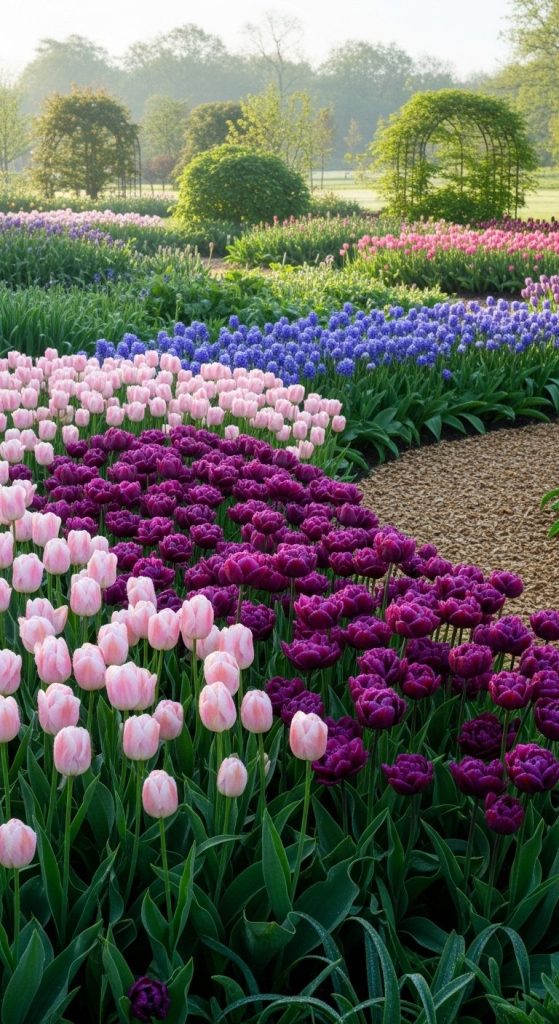 - Rich layering — Small bulbs in front, tall tulips behind.