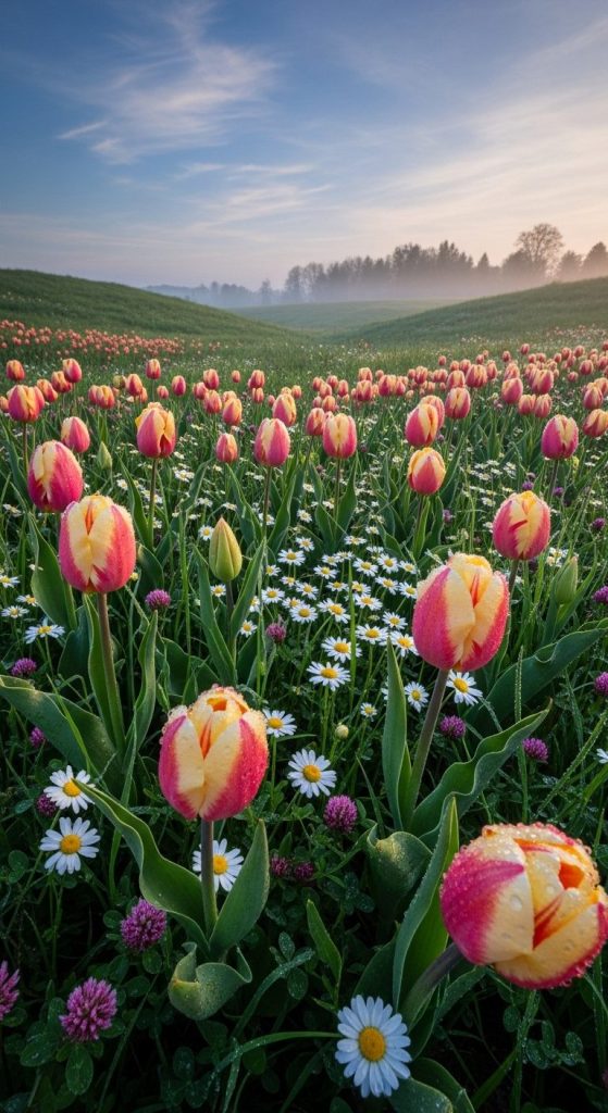 - Depth and movement — Taller tulips sway above shorter clusters.