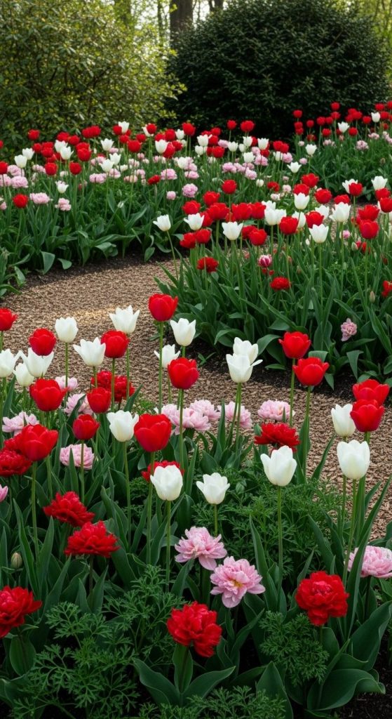 Use tulips to frame your garden paths or borders. They add structure, rhythm, and color exactly where the eye naturally travels.
