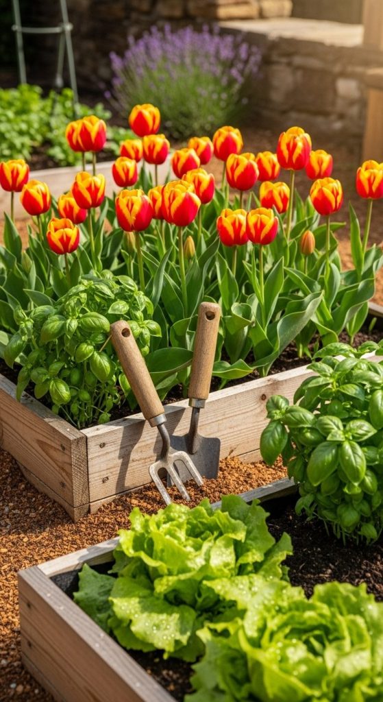 Mix tulips into kitchen gardens — you’ll enjoy both productivity and prettiness in one place.