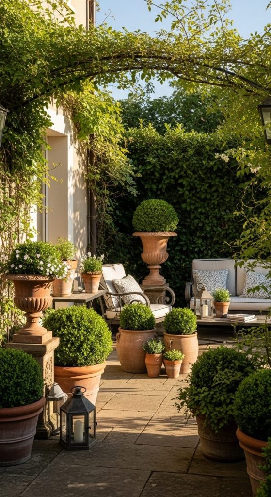 Terrace gardens maximize outdoor space, especially for villas with balconies or multiple levels. A mix of potted plants, small shrubs, and decorative urns adds depth and color.