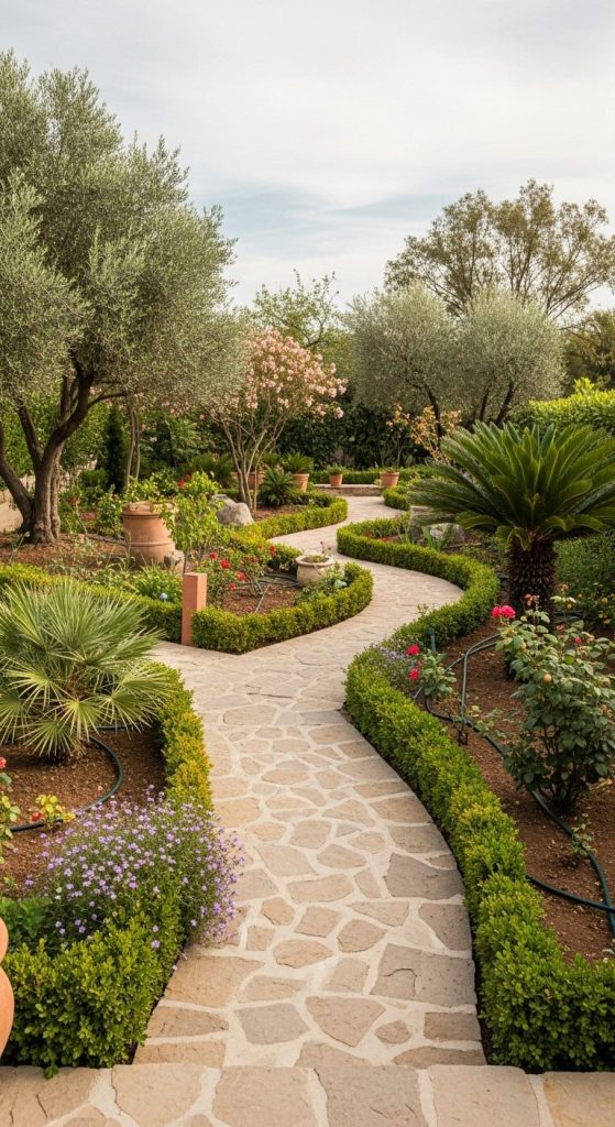 A winding stone path through a villa garden adds movement and charm. Pair with low hedges, flowering shrubs, or small palms for a classic villa aesthetic.