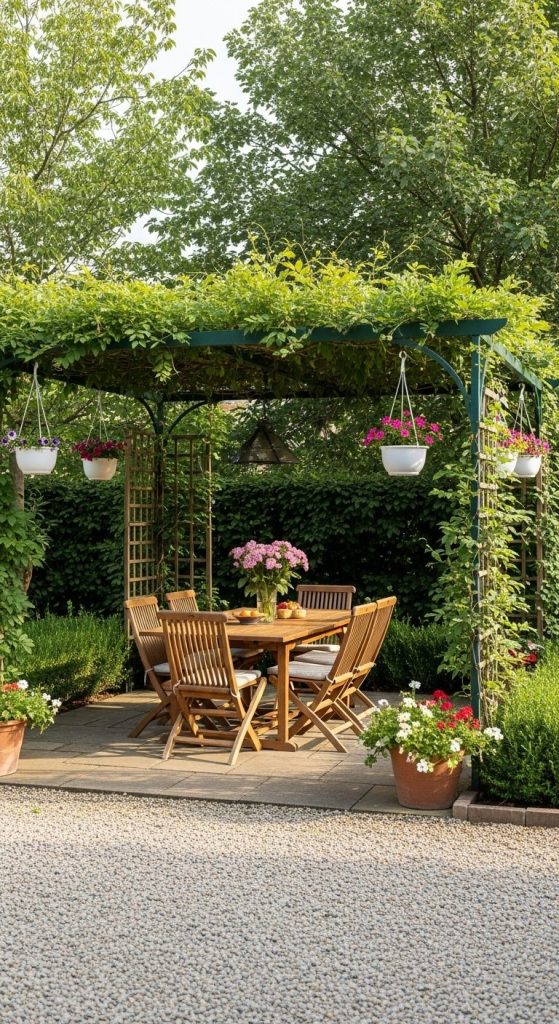 A villa backyard dining area under a pergola or tree canopy turns meals into memorable experiences. Complement with hanging planters or trellis plants.