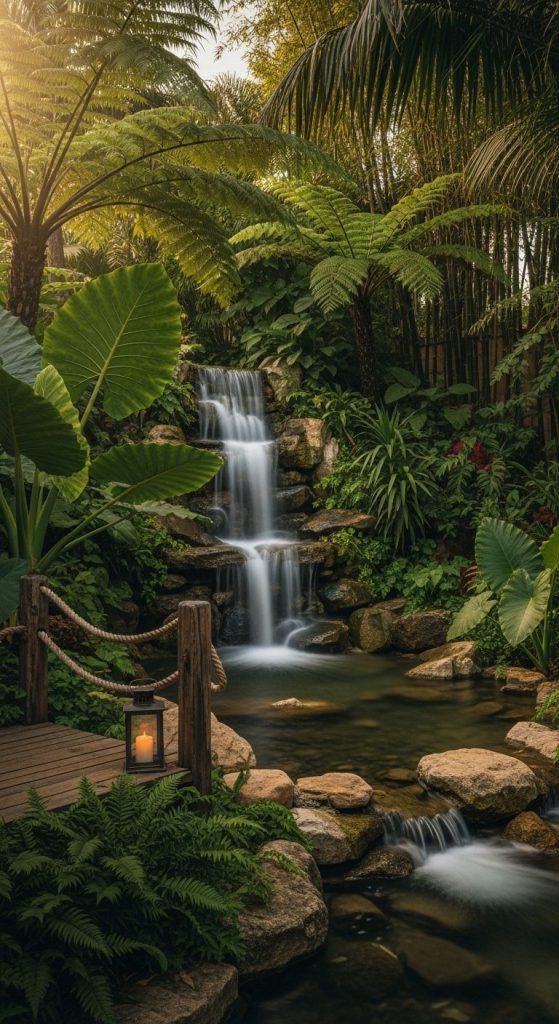Ever dreamt of Bali, Hawaii, or Thailand–style lushness? Tropical waterfall garden ideas bring that resort feeling right into your backyard. Think big leaves, warm textures, and soft flowing water.