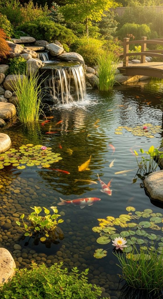 Combining a waterfall with a koi pond turns your backyard into a living, breathing ecosystem. Watching koi glide under falling water? Pure therapy.