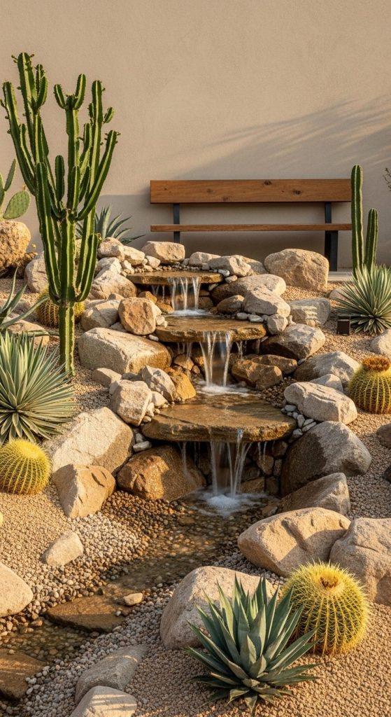 Who said you need lush greenery for a stunning waterfall? Desert-inspired designs use cacti, agave, and sandstone-like rocks for a grounded, earthy vibe.