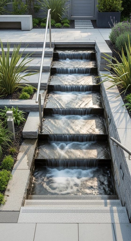This one’s visually striking — integrating water into a staircase so water flows down the edges or center. It’s bold, creative, and memorable.