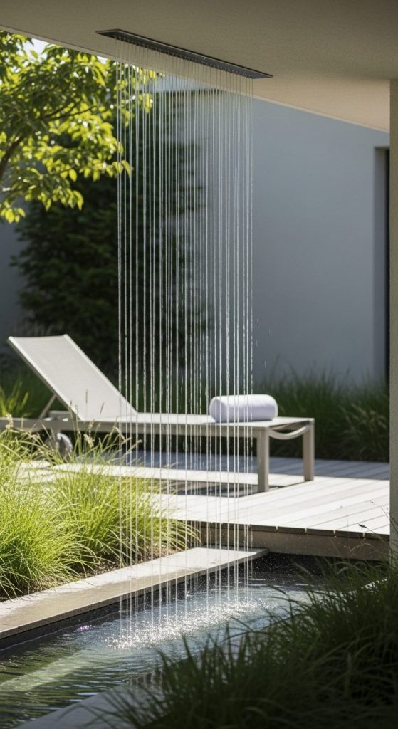A rain curtain pours water down in thin, parallel streams — almost like a delicate bead curtain. It’s relaxing, visually soft, and great for lounge spaces.