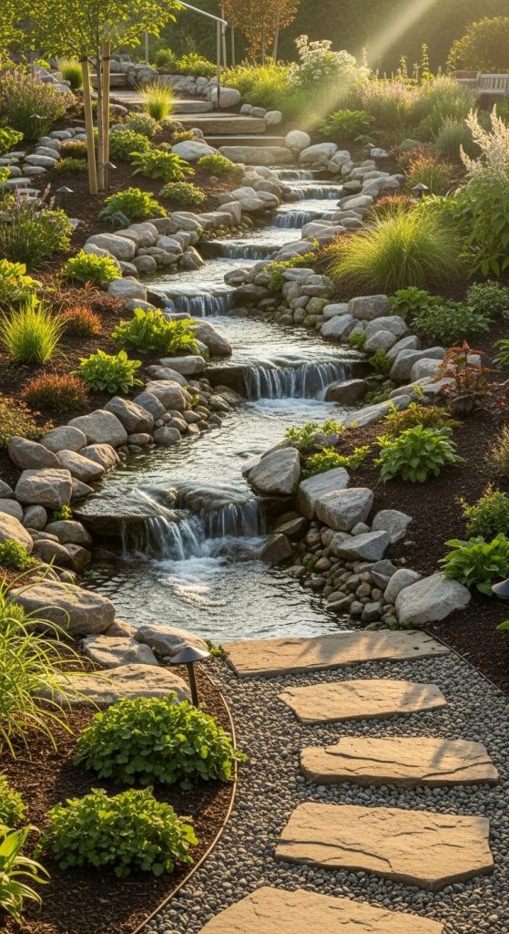 Instead of a single drop, a stream waterfall guides water along a winding path with small cascades. It feels like walking beside a tiny wild river every day.