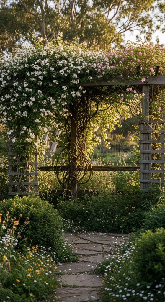 Choose fast-growing climbers like honeysuckle or clematis to achieve that effortless “wild” look while keeping blooms popping.