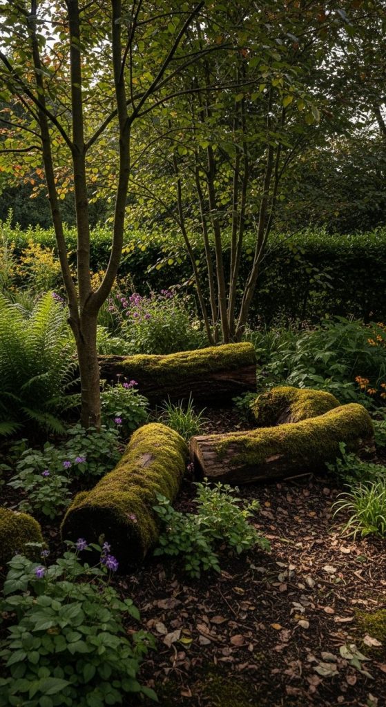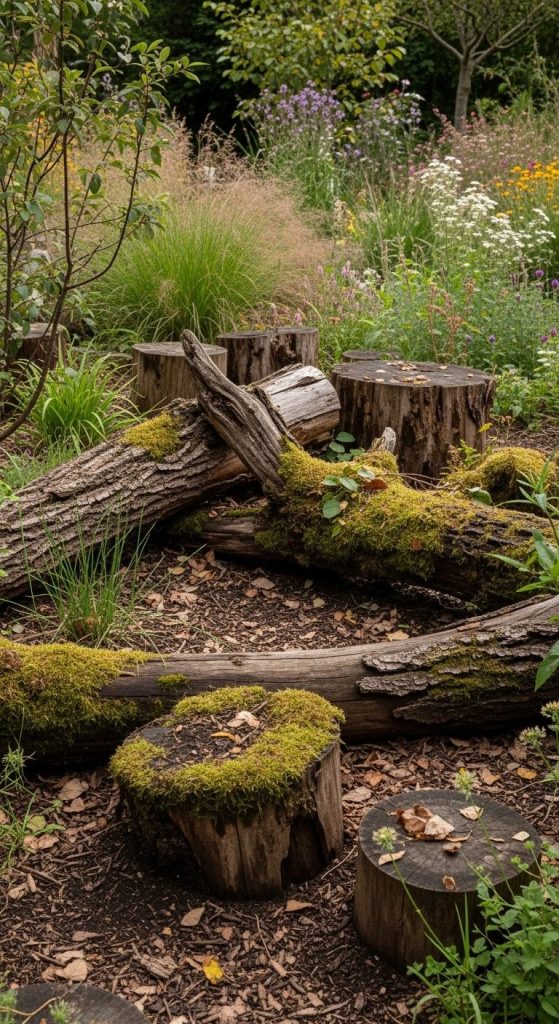 Logs, stumps, or branches left in corners create habitats for insects, fungi, and birds while adding visual interest.