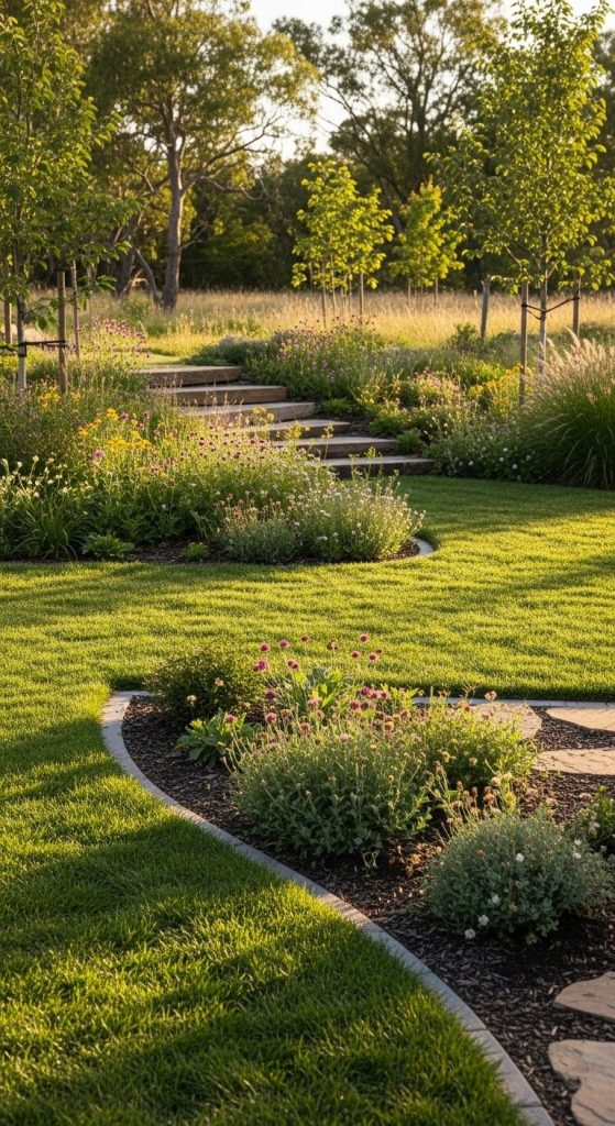 Instead of crisp boundaries, let your grass meet wildflower strips or shrubs naturally. Soft edges encourage pollinators and insects.