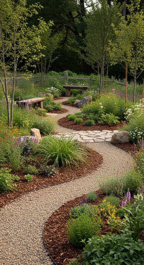 Paths don’t need to be straight. Curved, natural paths made of gravel, mulch, or stepping stones encourage exploration.