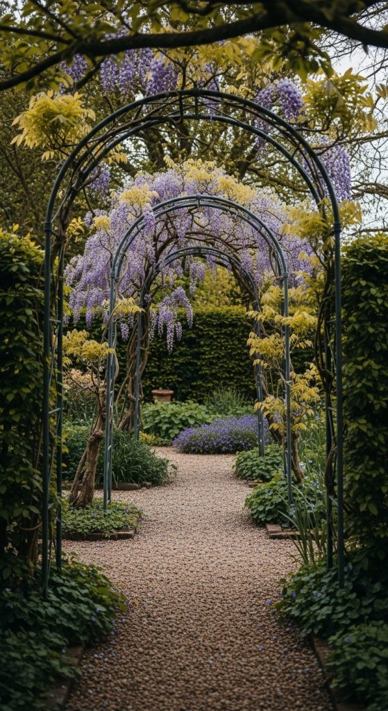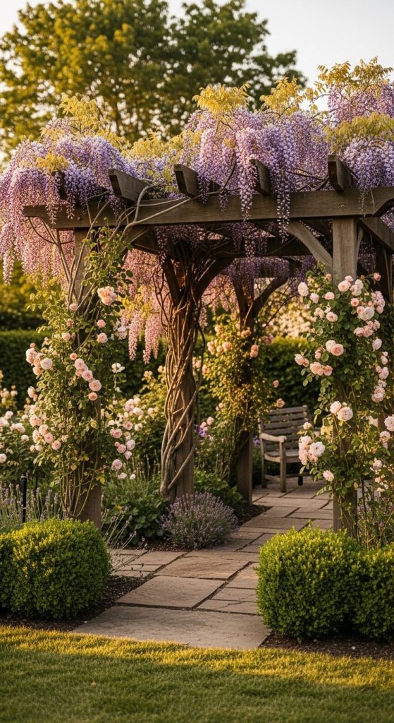 Takeaway: Layering climbers with wisteria = garden drama without sacrificing elegance.