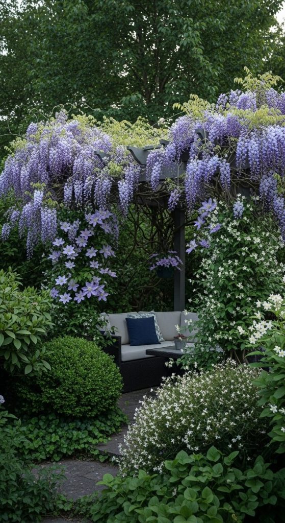 Combine wisteria with clematis or jasmine for multi-layered blooms.