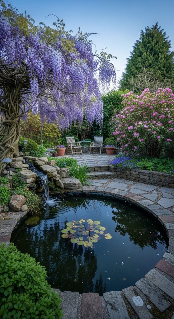 Pair cascading wisteria with a pond or fountain for serenity.