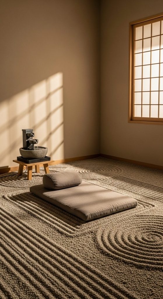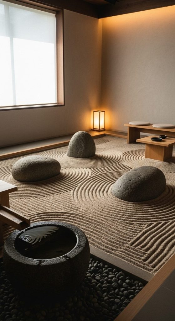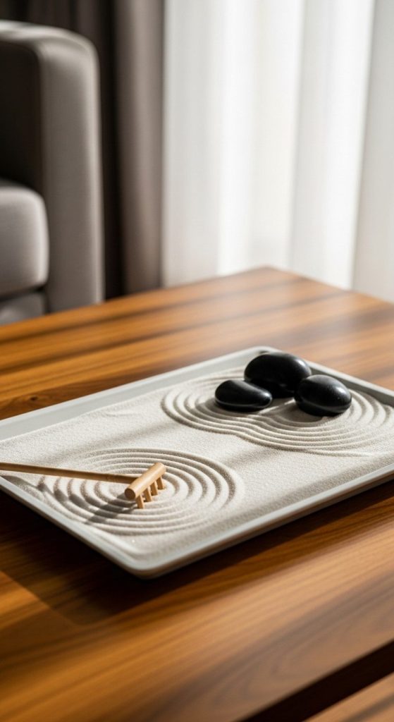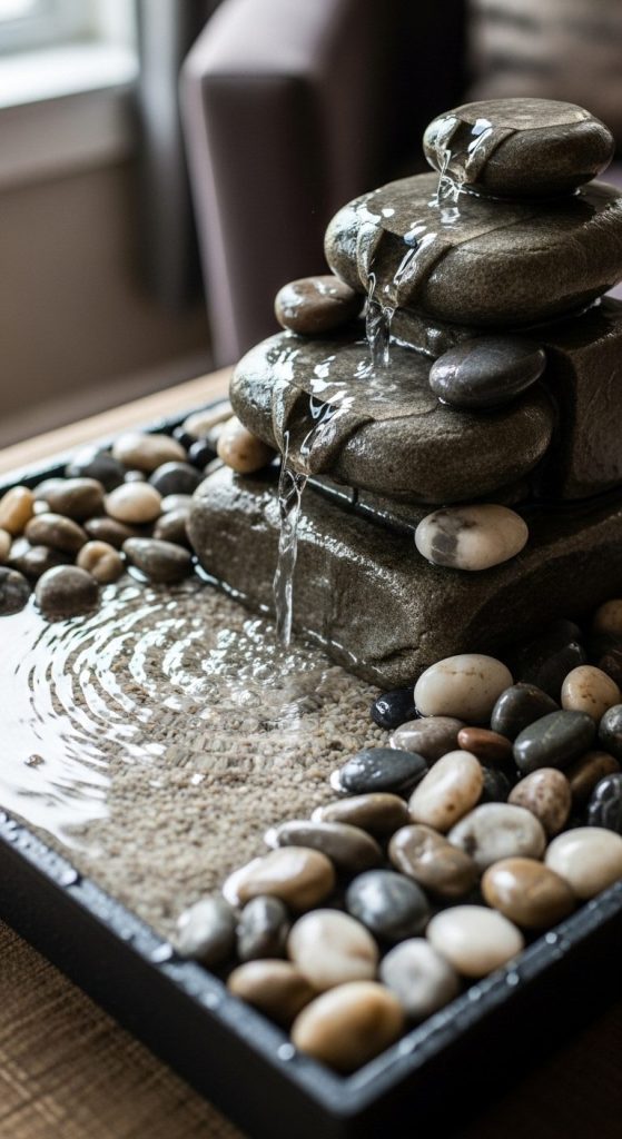Ever notice how the sound of running water instantly relaxes you? A small indoor water Zen garden captures that perfectly. Combine a tabletop fountain, smooth stones, and a sand tray.