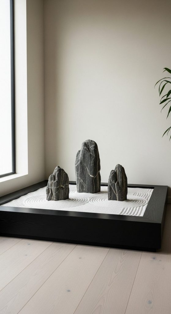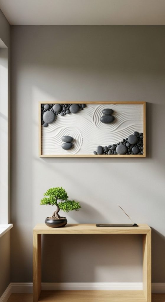 Yes, you read that right — a wall-mounted Zen garden. It’s like functional art that also calms your nerves. Use a wooden frame filled with sand or pebbles and a few minimalist stones.