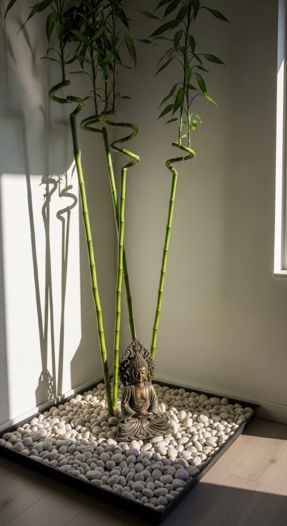 Turn that empty corner of your home into a peaceful bamboo and pebble Zen zone. Line the base with small white pebbles, place a few tall bamboo stalks in a vase or planter, and add a small Buddha or lantern.