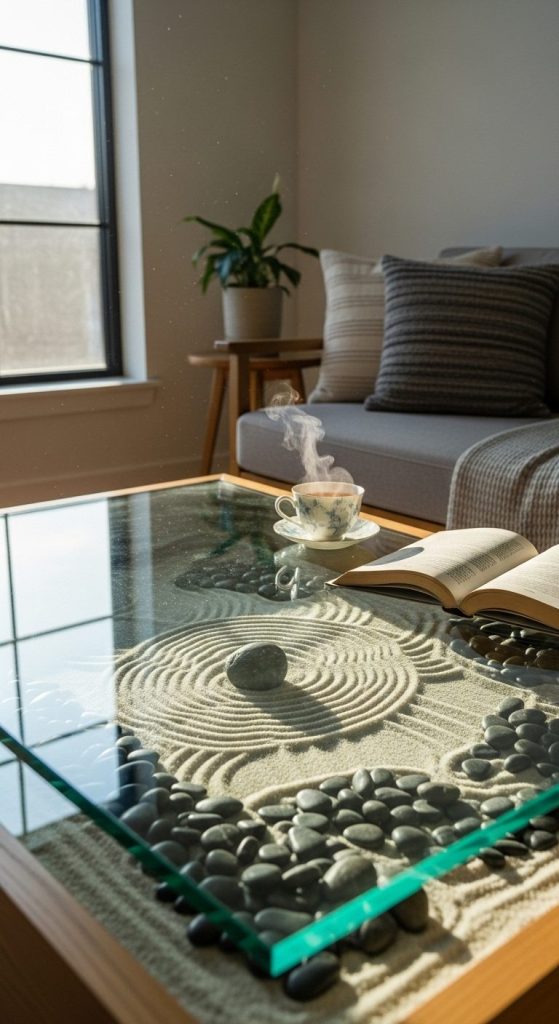 This one’s genius. Imagine your coffee table doubling as a Zen garden. You can buy or DIY a table with a glass top and a sand section underneath.