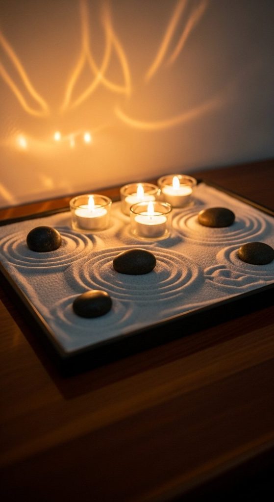 If you love ambient lighting, a candlelit Zen garden might be your dream décor. Combine white sand, tea candles, and river stones in a tray. The flickering light against the sand’s texture feels hypnotic.