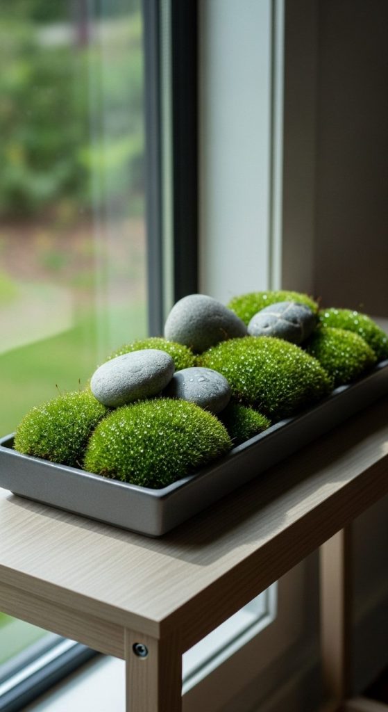 Add a lush touch to your living space with a moss and stone Zen garden. The deep green contrasts beautifully with light pebbles or white sand.