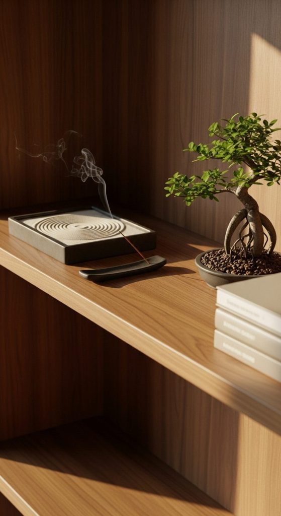 Got a floating shelf or bookshelf that needs life? Turn it into a mini Zen retreat. Place a sand tray, incense holder, and a few decorative stones or a bonsai tree.