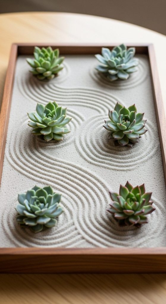 Want a living garden without the fuss? Combine sand with low-maintenance succulents for a modern Zen look.