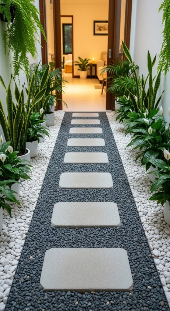 If you’ve got a hallway or entryway, turn it into an indoor Zen path with stepping stones surrounded by small gravel or sand.